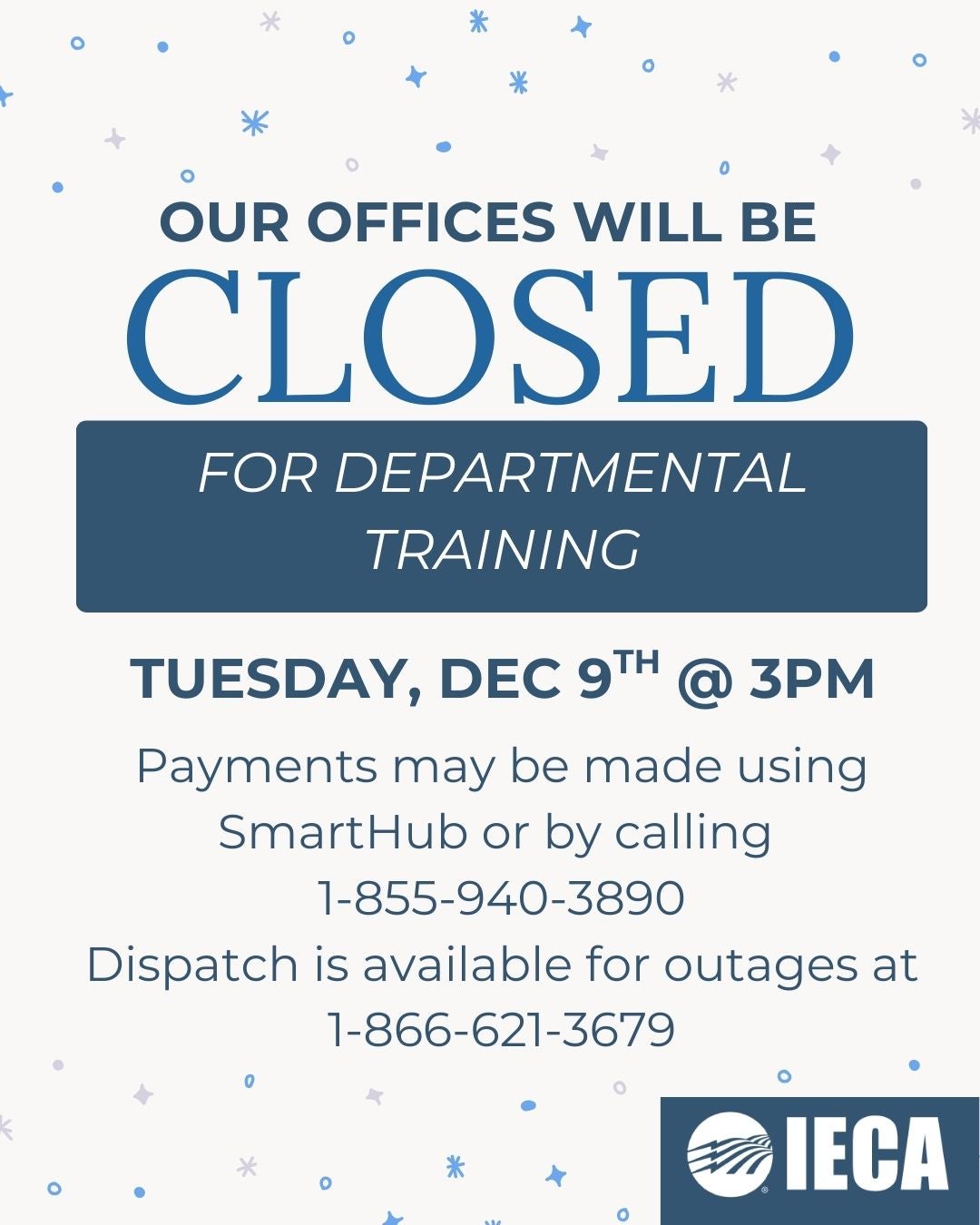 All IECA offices will be closing at 3:00 pm Tuesday December 9th, 2025 for Departmental Training. Payments may be made using SmartHub or calling the pay by phone number 855-940-3890.