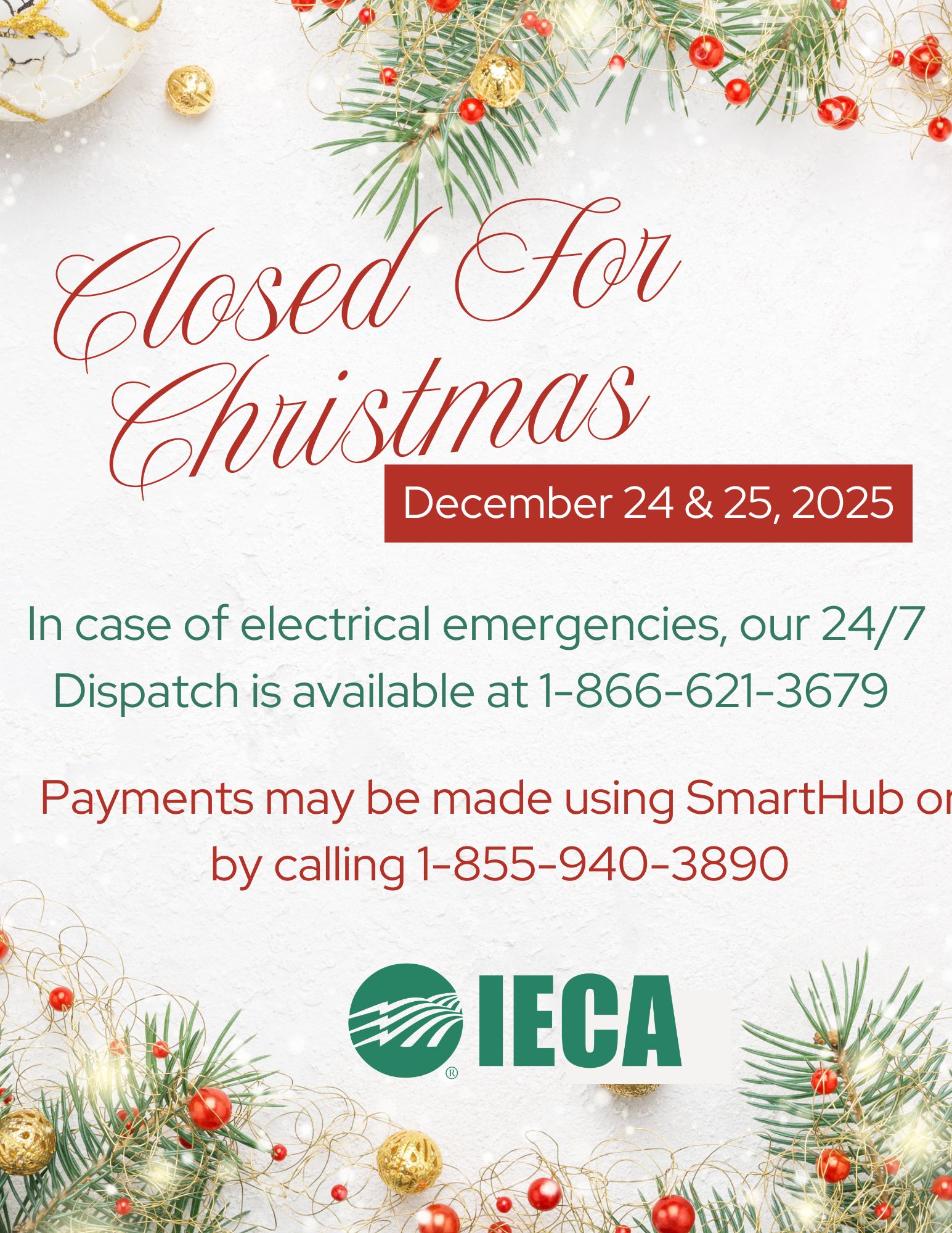 If you have a payment you would like to make while we are closed payments may be made via SmartHub or by calling our pay by phone number at 855-940-3890.
