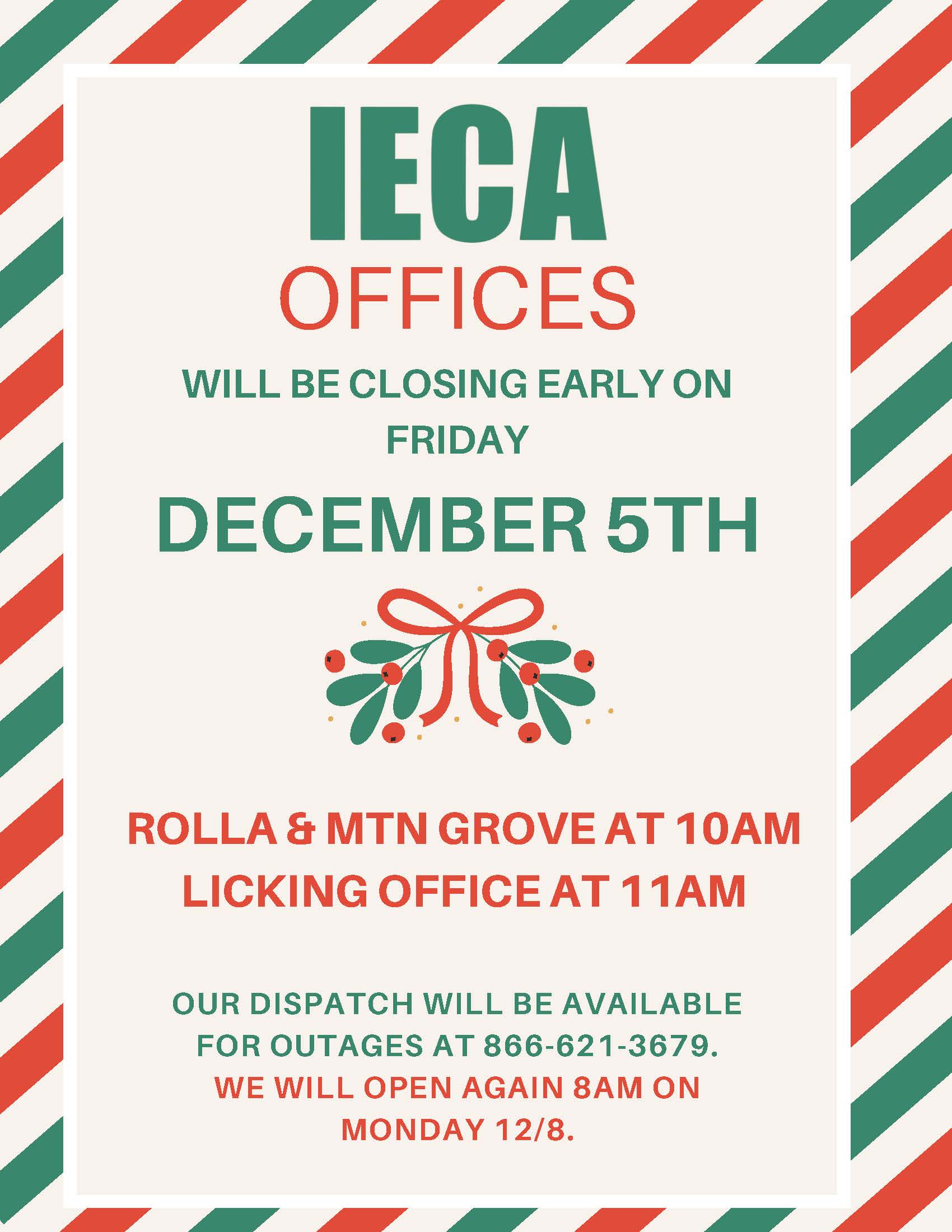 IECA offices will be closing early Friday December 5, 2025. Rolla and Mountain Grove locations will be closing at 10:00 a.m. and the Licking location will be closing at 11:00 a.m. All offices will resume regular business hours at 8:00 Monday December 8.