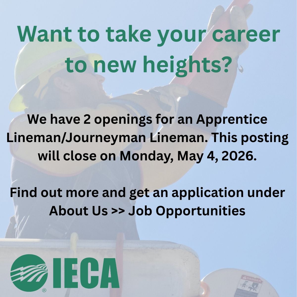 Applications for 2 Apprentice Journeyman Lineman positions will be accepted until 5:00 pm, Monday, May 4, 2026.