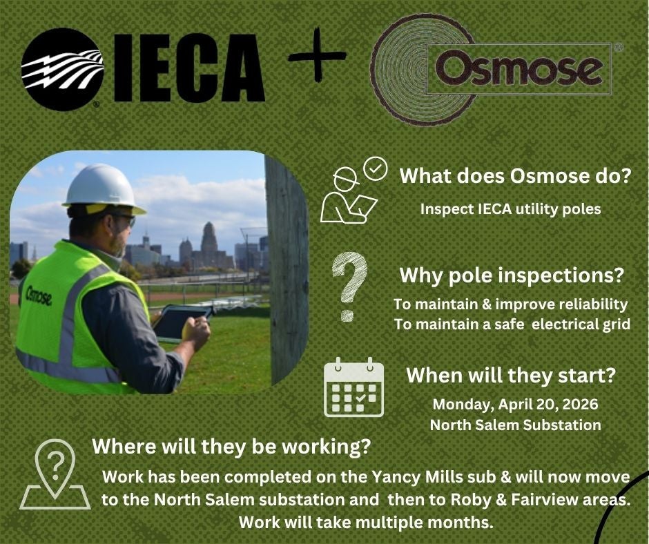 The inspection of poles in the Yancy Mills region has been finalized, and the next phase will take place at the North Salem substation. Osmose, contracted through #IECA, will be using marked vehicles but might also utilize all-terrain vehicles or walk as they need to inspect each pole thoroughly. Should you have any questions, please reach out to the office at 866-621-3679.