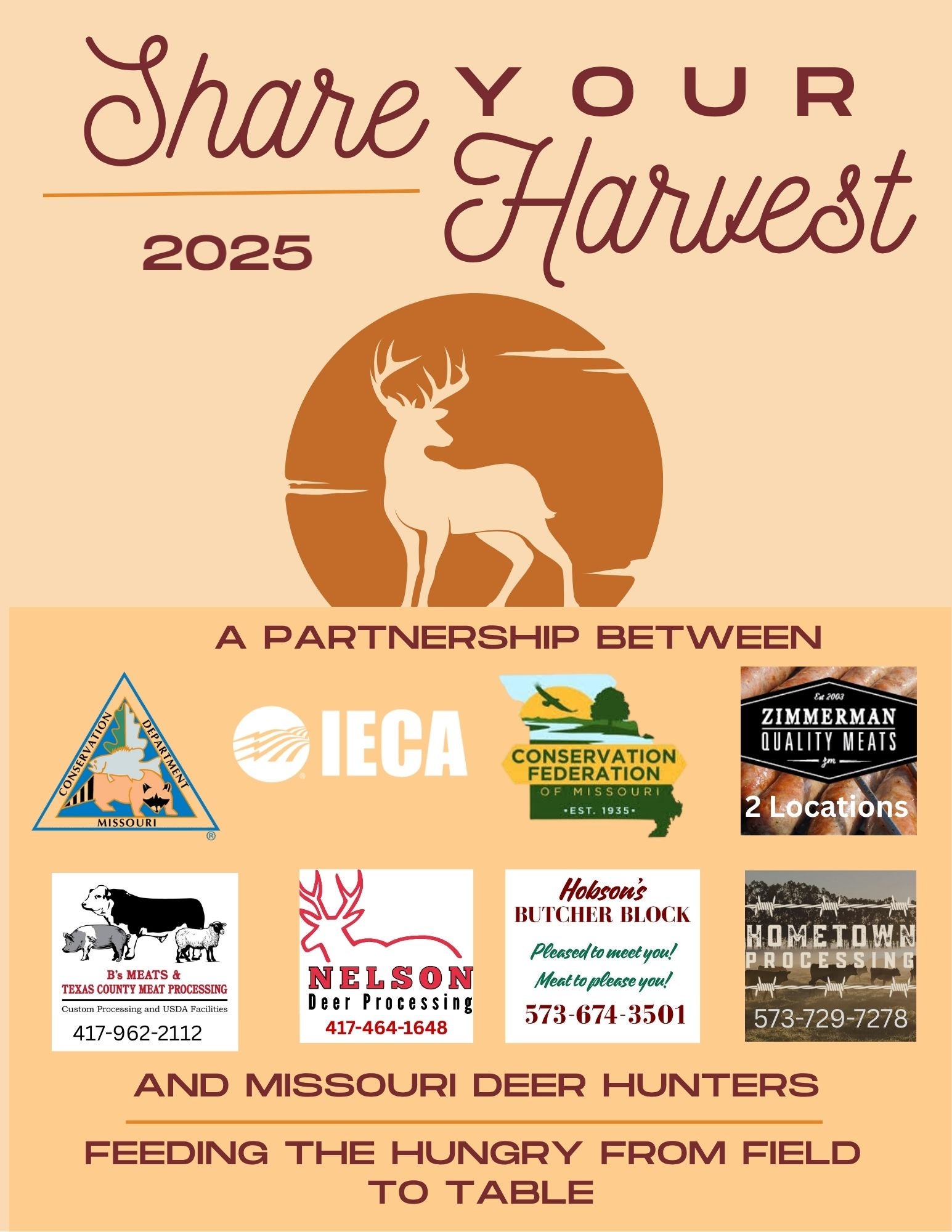 IECA has teamed up with the Conservation Federation of Missouri and their Share the Harvest program to provide an easy way for hunters to donate venison to Missourians in need. Hunters may donate their extra venison to our participating meat processors who will grind and package the deer meat. The packaged venison will then be given to a local food pantry for distribution to local residents in need of food assistance.